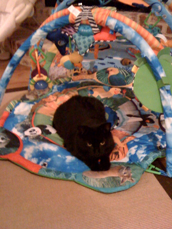 The first one, my favorite is Buddy's Baby Einstein mats. He started out with one,"the ocean adventure one", since I wanted him to have some sort of a beach here in Mississippi, and has recently gotten "the around the world mat", I wouldn't want him getting bored with just one. :)He has been playing with these since he was only 1 month old. He stays on them for an hour at a time and just talks away. There is a mirror on each which he LOVES to stare at himself for a good 30 minutes at least. The second item being a Boppy Lounger. NOT the boppy that looks like a U but the one that has a middle. It is a MUST in our household. Lil E sleeps, eats, lounges, talks,and watches tv in it. He LOVES it. Mom and Dad love it too, because if you don't want to hold your sweet one all day long this is a great solution! So for all of those having little ones or need a great baby shower gift that is a little different these are great! Also as you will see in the photos below Cricket thinks whatever is Easton's is hers also :)